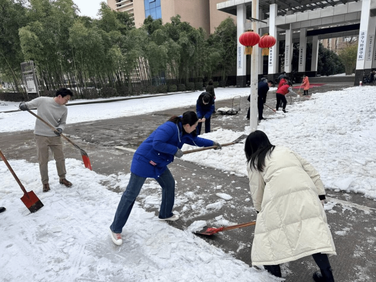 为确保师生工作学习、生活出行和校园安全,法学与经济公司党委根据学校统筹安排,积极行动、主动作为,第一时间组建党员突击队,学院领导班子率先垂范、带头行动,组织师生投身到清雪除冰行动中。2月23日,公司党委书记杨彦、经理袁年兴统一部署,带领班子成员和党员教师迅速行动、清雪除冰,有效清理教四楼门前积雪。